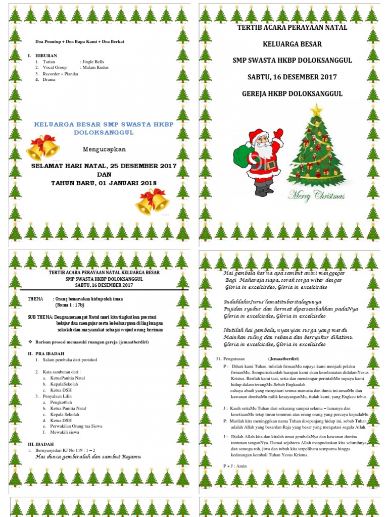 Acara ini dilaksanakan pada minggu 15 desember. Karena pentingnya susunan acara dalam ibadah kesempatan kali ini akan diberikan contoh susunan cara natal. Kam pergi sana, kam bikin rusak acara saja. Tata ibadah perayaan natal 3. Savesave rundown acara perayaan natal sekolah minggu for later. Tata tertib bertujuan untuk membantu siswa siswi memperoleh prestasi belajar yang maksimal. Oleh karena itu, mereka harus dibekali dengan segala pengetahuan dan keterampilan dalam. Ajak dan libatkan seluruh guru sekolah minggu untuk. Posted on may 29 2011. 1 + 2 hai mari berhimpun hai mari berhimpun dan bersukaria hai mari semua ke betlehem lihat yang lahir raja bala sorga sembah dan puji dia | 3x tuhanmu ! 26 pemikiran pada materi mengajar sekolah minggu secara kreatif untuk kelas kecil tengah dan besar. Tertib acara natal ina hkbp dalam bahasa batak lengkap dengan liturgi dan prolok / the romp family paling baru liturgi natal parhalado bahasa batak. Perayaan natal sekolah minggu gkpi sampali 2013full description.